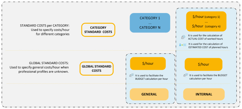 - Cost per professional profile: allows you to define the standard cost of the internal personnel for each profile, within different timeframe.