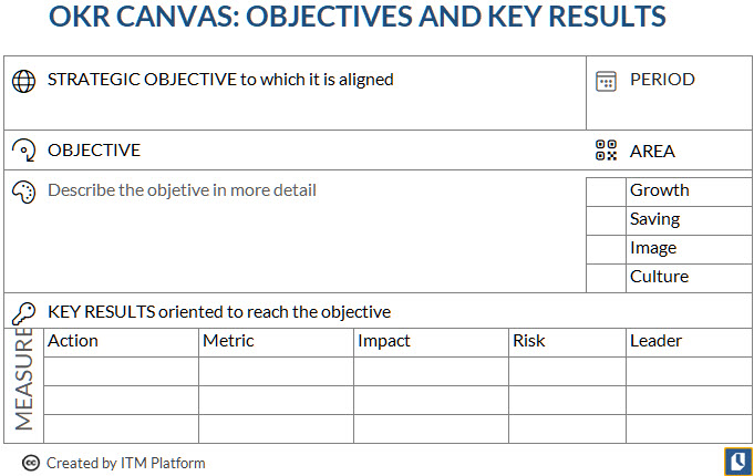 Those organizations that are accustomed to traditional management models may find it helpful to use a Canvas to arrive at the definition of their OKRs.