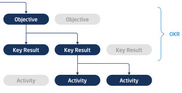 OKRs integrate into an intermediate level of the management model. In the context of an organization, they fill the tiers between strategic objectives and the activities that ultimately implement them.
