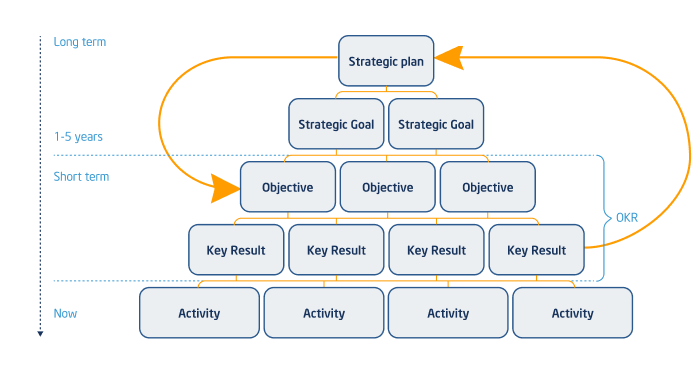 Between strategic planning and the execution of day-to-day activities are several hierarchical levels and a multitude of people transmitting ideas among each other. OKRs ensure that the finished result is reflective of the initial plan.