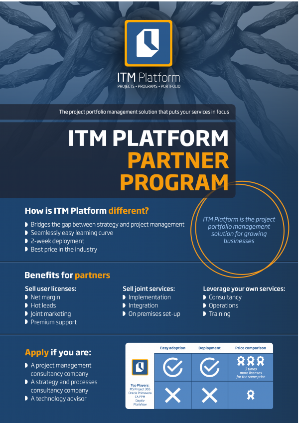 Discover the advantages of being an ITM Platform partner. We want to help grow your business by working together, providing a better service and, above all, using the online project, program and portfolio management solution that your clients will love.