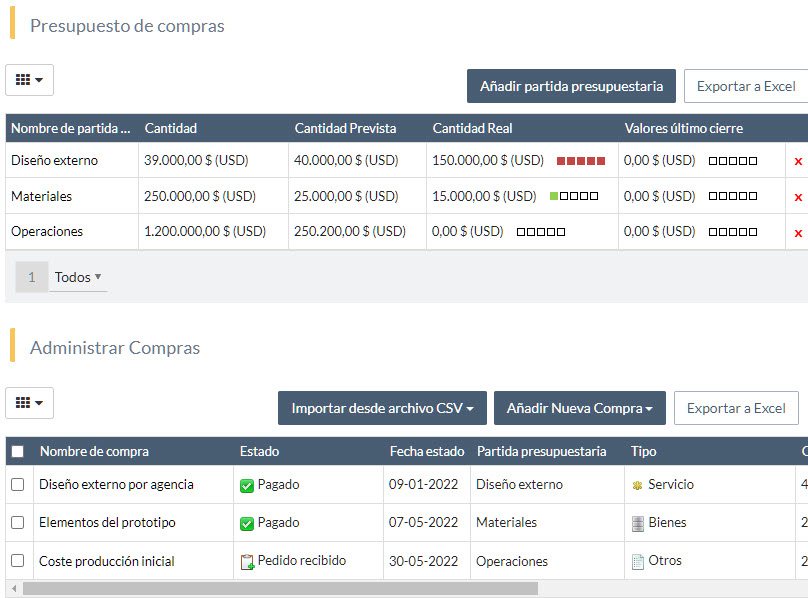 Si sus proyectos requieren el consumo de bienes o servicios, estos suelen organizarse en torno a cuentas presupuestarias que incluyen tales compras. Las compras se planifican en el marco del proyecto, pero un sistema de terceros pueder llevar a cabo el proceso de adquisición.