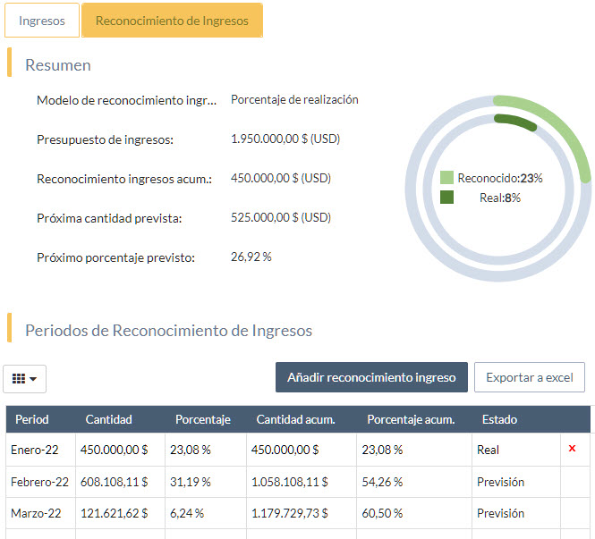 Para el caso de una gestión avanzada de reconocimiento de ingresos, estos se gestionan típicamente en el PPM ya que ya que proyecto e ingresos están íntimamente relacionados.