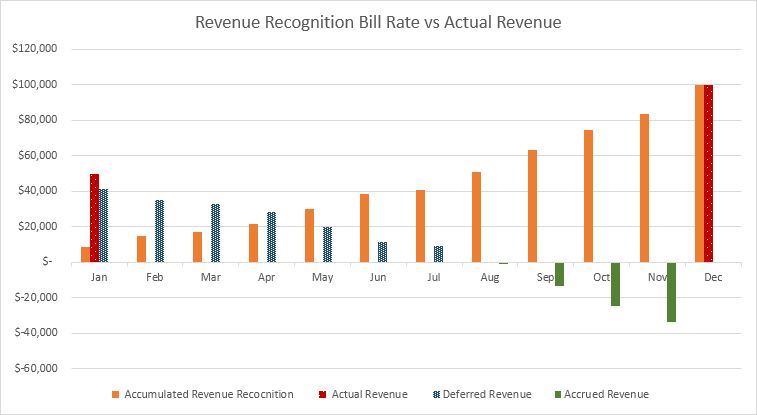 Debido a que se factura $50,000 al inicio del proyecto, cada mes hasta julio las cuentas de The Fifth Big muestran ingresos diferidos inicialmente, que disminuyen a medida que avanza el reconocimiento de ingresos. Desde agosto hasta el final del proyecto, se trabaja, pero no se factura – lo que genera ingresos devengados hasta diciembre (ver tabla).