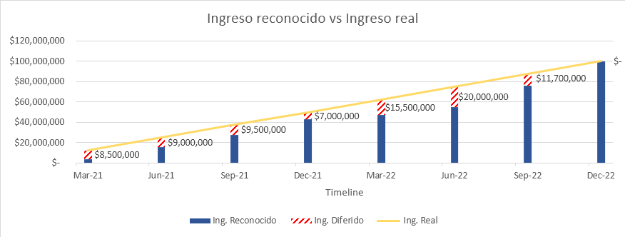 Veamos ahora cómo se desarrollan el reconocimiento y el progreso de los ingresos a lo largo del tiempo.