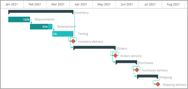 Su empresa desarrolla un software de tamaño mediano para un cliente minorista, Rain Forest, que incluye cuatro módulos: Inventario, Pedidos, Compras y Envío. El presupuesto total de ingresos es de $100,000, con un tiempo de entrega estimado de seis meses para los cuatro módulos.
