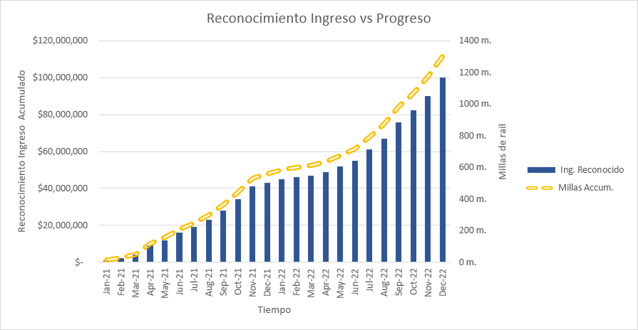 En el primer trimestre hasta marzo de 2021, Silver Railway construye un 4% de los 1.300 km. Eso le permite reconocer el 4% de los ingresos ($4 millones), aunque presenta al cliente una factura por $12.5 millones según lo acordado. Se han devengado ingresos por un valor de 8,5 millones de dólares.